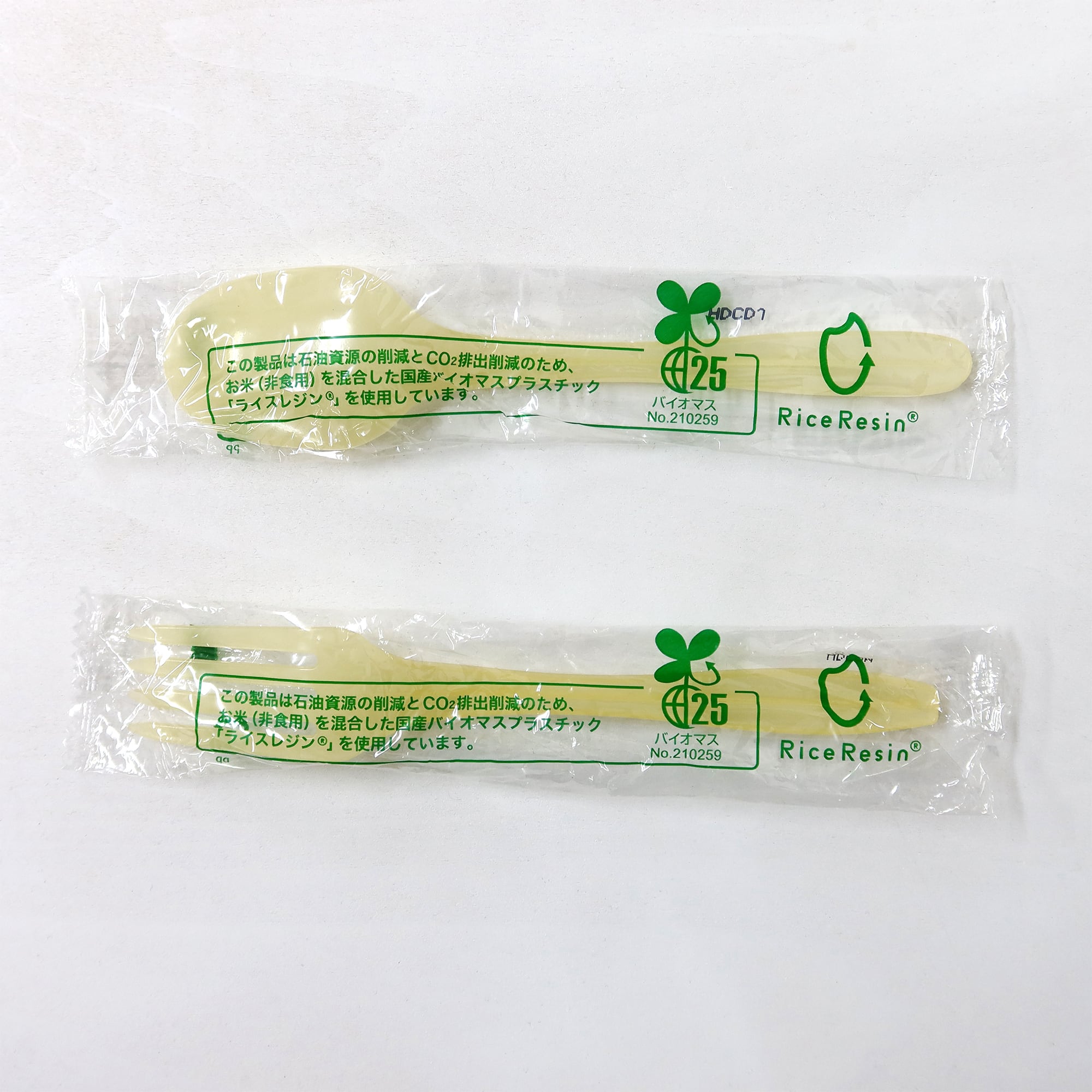 古米や破砕米など食用に適さないお米を原料とする国産バイオマスプラスチック「ライスレジン®」で作られており、石油資源の節約と温室効果ガス排出低減に取り組んでいます。