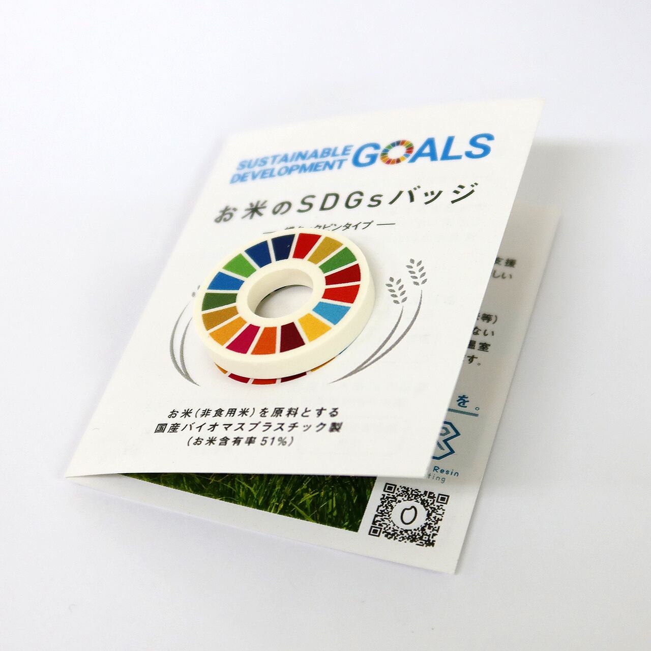 古米や破砕米など食用に適さないお米を原料とする国産バイオマスプラスチック「ライスレジン®」で作ったSDGsバッジです。石油資源の節約と温室効果ガス排出低減に取り組んでいます。